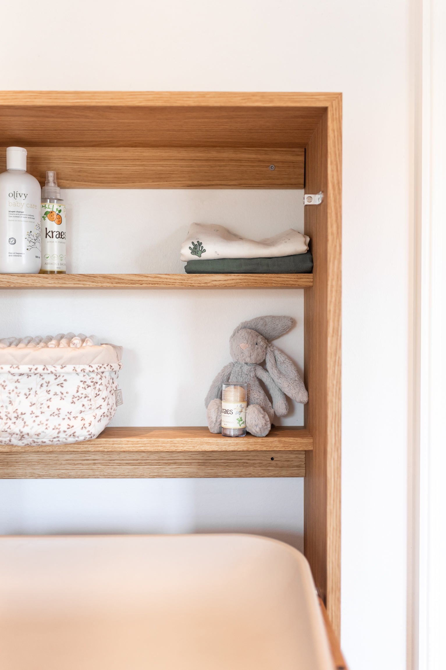 Når der ikke længere er behov for bleskift, kan puslebordet laves om til et smukt skab til børnebøger og legetøj. Når der senere hen bliver behov for plads til lektier og kreativ udfoldelse, kan skabet transformeres til skrivebord.